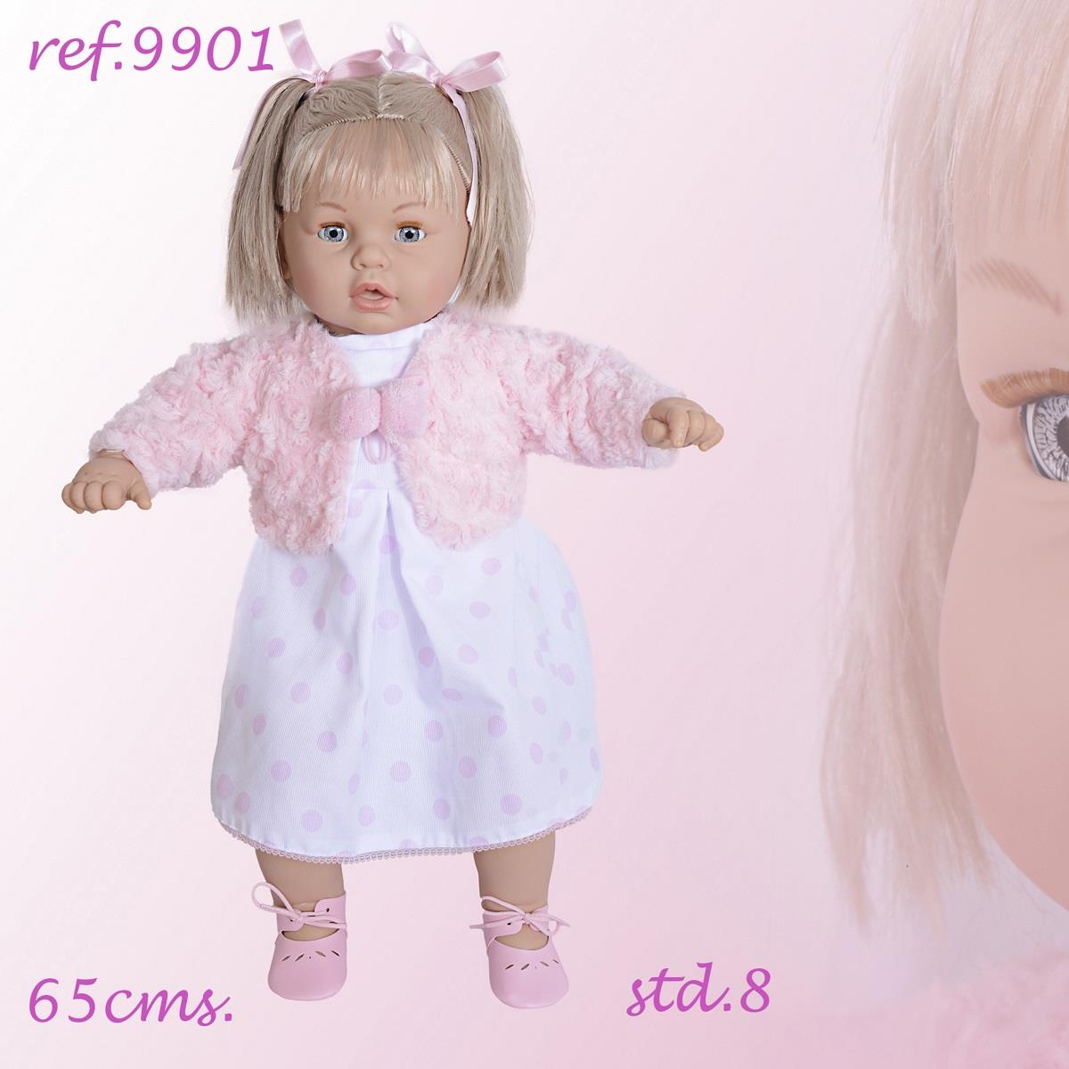 Boneca 65 cm com cabelo e ropinha, quando a chupeta é retirada diz “Mamã, Pápá”