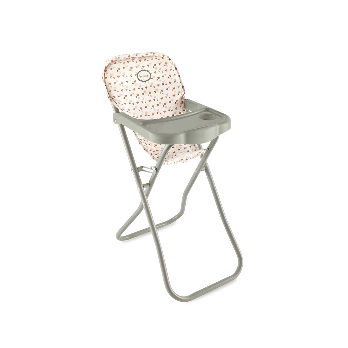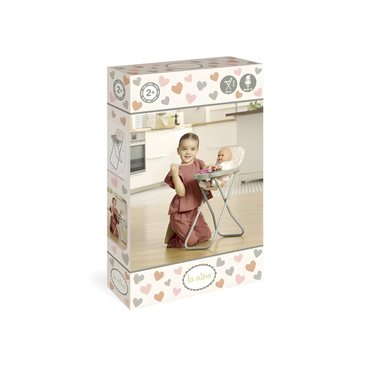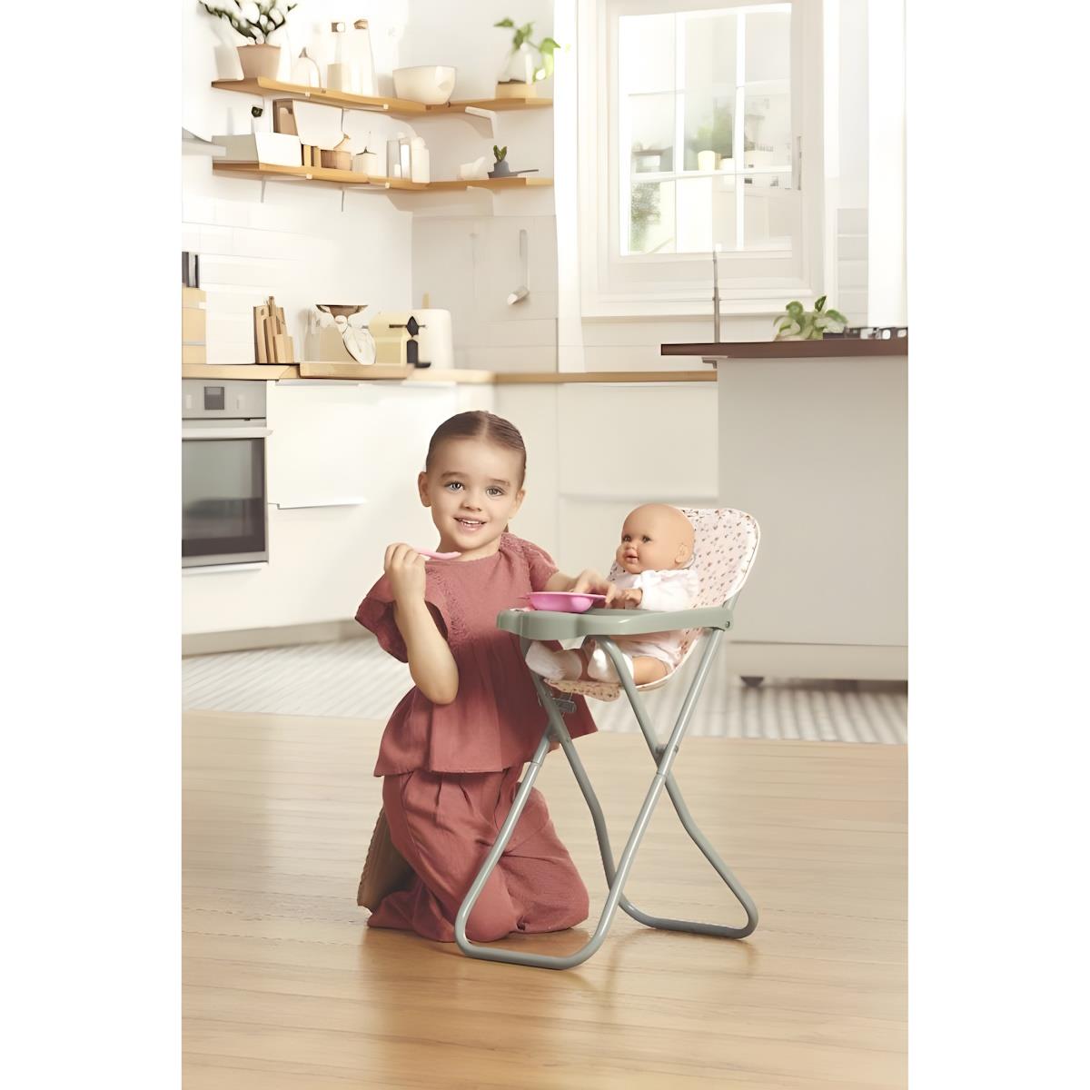 Cadeira dobrável. Fabricado com materiais de qualidade e estrutura metálica. As crianças podem sentar as suas bonecas nele para as alimentar. A boneca que cabe na cadeira pode medir entre 36 e 52 cm. O tecido é facilmente removível para lavagem na máquina. Recomendado para crianças a partir dos 2 anos de idade.