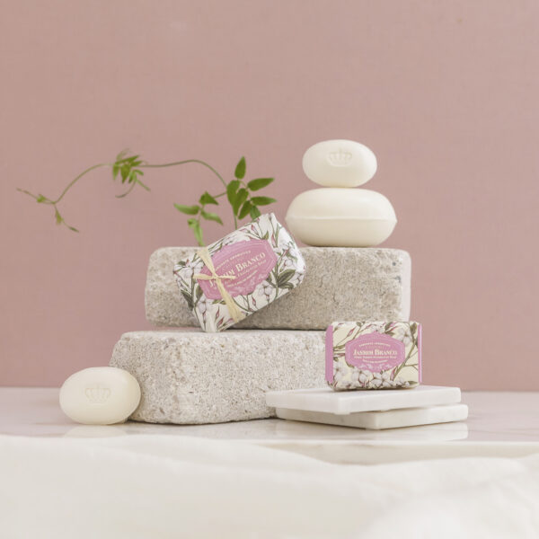 Fragrância máxima em tamanho reduzido! De espuma tão suave quanto o seu aroma, o sabonete Castelbel Jasmim Branco é elaborado com uma base 100% vegetal e embalado à mão pelas nossas artesãs numa embalagem decorada com ilustrações florais de jasmins brancos.