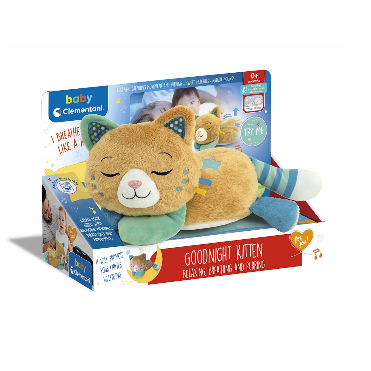 O gatinho toca melodias, música clássica, sons brancos e ruídos da natureza, recriando uma atmosfera propícia ao repouso. A personagem pode ser lavada na máquina depois de retirado o módulo eletrónico.