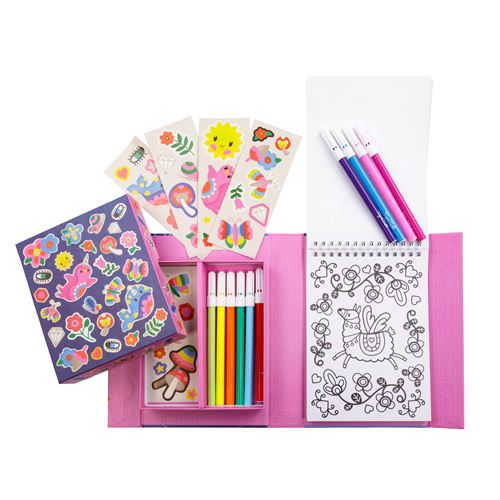 Contém: 36 páginas para colorir; 5 folhas de autocolantes; caixa de armazenamento acessível; 10 canetas de feltro coloridas de qualidade.”