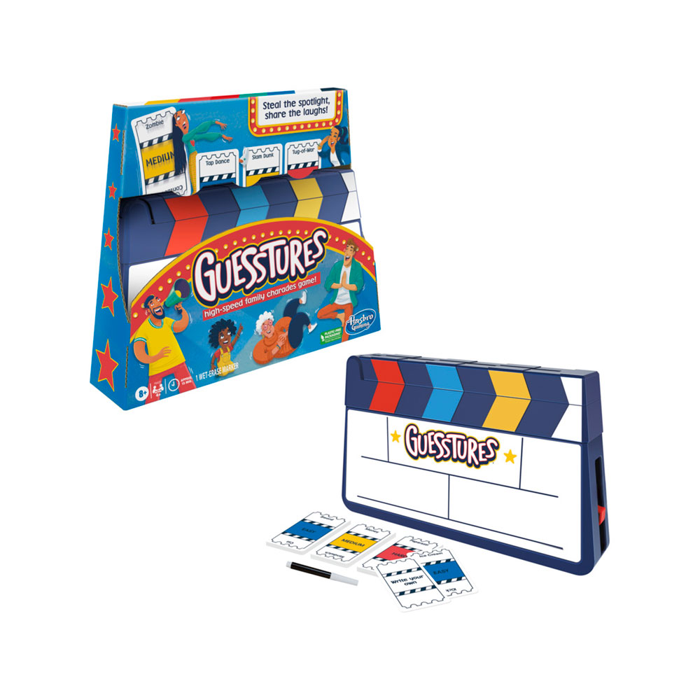 Muitas risadas com Gestos, o jogo de adivinhação para toda a família. Basta colocar 4 cartas no Cronômetro de Ação e tentar fazer sua equipe adivinhar a palavra em cada carta na velocidade da luz. Mas cuidado para não deixar a carta cair na unidade de jogo! Após um jogador adivinhar uma palavra, ele deve pegá-la rapidamente antes que o Cronómetro de Ação a ?engula?. Este jogo para grupos pequenos ou grandes inclui 4 níveis para jogar: Fácil, Médio, Difícil e Personalizado. Os jogadores podem personalizar algumas cartas e criar seus próprios desafios engraçados. Personalizar a frente do Cronómetro de Ação com o marcador-apagador! Quando o jogo acabar, a equipe com mais pontos é a vencedora! O divertido jogo Gestos é ótimo para adolescentes, estudantes universitários, adultos e crianças a partir dos 8 anos.