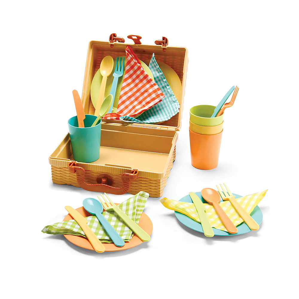 Brinquedo divertido composto por um conjunto diversificado de peças que permitem à criança uma interação lúdica com a tarefa de imitação de uma cena de piquenique.