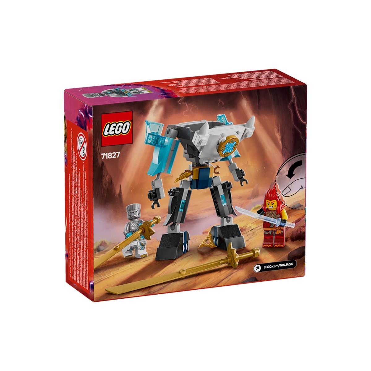 O conjunto LEGO® NINJAGO® Traje de Meca de Batalha do Zane (71827) permite que meninos e meninas maiores de 6 anos vivam a ação eletrizante da temporada 3 da série de TV NINJAGO Ascensão dos Dragões. Este conjunto de construção para crianças inclui um meca NINJAGO com braços, pernas e mãos articuláveis, um torso que gira em 360 graus, um peito que abre para colocar uma minifigura dentro e duas enormes espadas. Este conjunto LEGO inclui três minifiguras de NINJAGO: o Zane com dois shurikens, a Wyldfyre com uma catana de cristal e Drix, o Mestre do Enxame dos Cinco Sombrios, com duas foices. Com tantas opções, as crianças podem desfrutar de horas de aventuras mergulhadas no mundo de NINJAGO. A linha LEGO NINJAGO de conjuntos e brinquedos de ação para construir inclui mecas, dragões e templos para que fãs possam viver a ação. Cada conjunto de ninja pode ser criado com o aplicativo LEGO Builder, que guia você e seu filho em uma aventura de construção fácil e intuitiva.