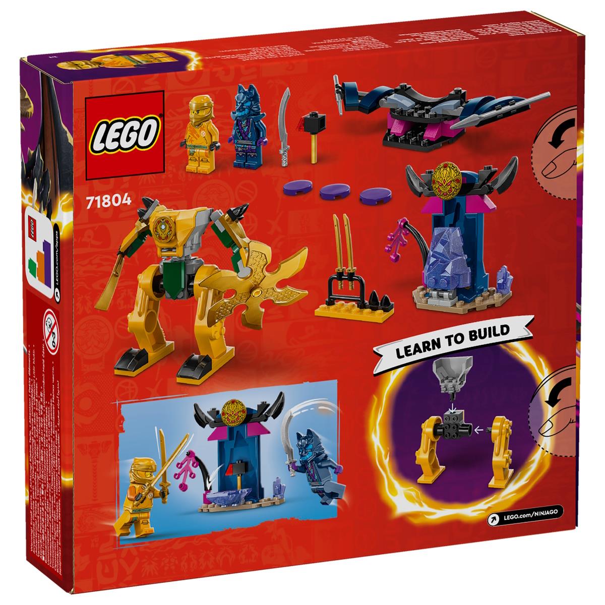 O Robô de Combate do Arin permite que as crianças aprendam a construir enquanto unem forças aos heróis ninja e tentam salvar os seus amigos dragões. Este brinquedo de encenação inclui uma impressionante figura de robô para inspirar as crianças a recriarem aventuras emocionantes da temporada 2 de NINJAGO® A Ascensão dos Dragões. Este set LEGO® inclui 2 minifiguras, Arin com uma catana e um Guerreiro da Máscara de Lobo com uma espada. O Arin pode ser colocado no robô ajustável, composto por uma espada grande e giratória, enquanto o Guerreiro da Máscara de Lobo pode voar num planador com asas ajustáveis, disparador de discos e 2 lanças. Existe ainda uma caverna de cristal com martelo mágico no interior com prateleira de armas e 2 catanas douradas. Este brinquedo proporciona uma experiência divertida para crianças que estão a descobrir a construção LEGO. O set inclui uma Peça Inicial, uma base parcialmente construída que permite que as crianças comecem rapidamente a construir com confiança.