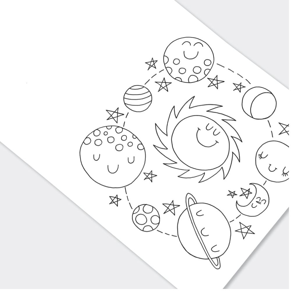 Este livro de colorir infantil com tema espacial, vibrante e deslumbrante, contém 12 páginas com personagens temáticos para colorir. As páginas internas são impressas apenas de um lado, deixando o verso em branco para desenhos ou escrita.