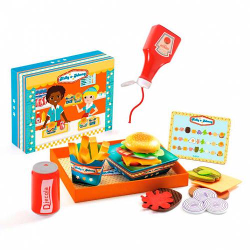 Esta bonita caixa de madeira contém todos os acessórios necessários para preparar três deliciosos hambúrgueres. As crianças podem confecionar os hambúrgueres como quiserem ou seguir as sugestões do cartão do menu. Só falta desfrutar!