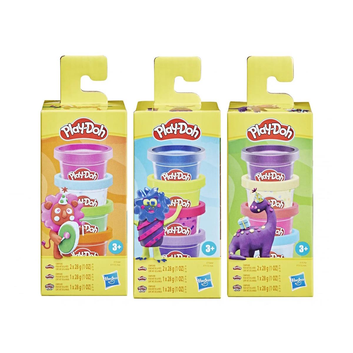 Inclui vários potinhos de massinha Play-Doh em diversas cores vibrantes.