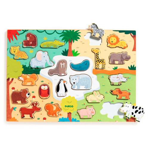 Desc. Técnica: Um puzzle de madeira com temática animal. Coloque os 22 animais nos seus lugares, reconhecendo as suas formas e habitat no quadro.