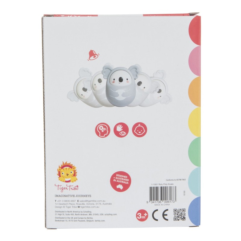 O Roly Poly Koala adora ser empurrado, puxado ou derrubado – levantando-se sempre para se divertir mais. A parte inferior arredondada e pesada girará de volta à posição vertical para brincar mais. E enquanto rola, emite um adorável som de sino, para estimulação sensorial adicional. Ideal para bebés que estão a aprender a gatinhar, a ação oscilante do Koala estimula os pequenos a estender a mão e empurrar. A ação repetitiva melhora a coordenação olho-mão e as habilidades motoras finas, ao mesmo tempo que ajuda a desenvolver uma compreensão de causa e efeito. As orelhas oferecem um ótimo ponto de aderência para mãos pequenas. Este produto faz parte da nossa nova gama ECO criada a partir de bioplástico. Idades adequadas 3m+ Mais informações: • Livre de ftalatos, PVC, cádmio, BPA e chumbo • Produto testado de forma independente de acordo com os padrões australianos AS/NZS 8124.1 e ASTM (EUA) e CE (Europa) • Mede 9 cm x 16,5 cm Parte da linha Eco da Tiger Tribe usando bioplástico Feito com embalagens 100% recicladas O produto comercializado tem a marcação CE. Não funciona com pilhas e/ou baterias
